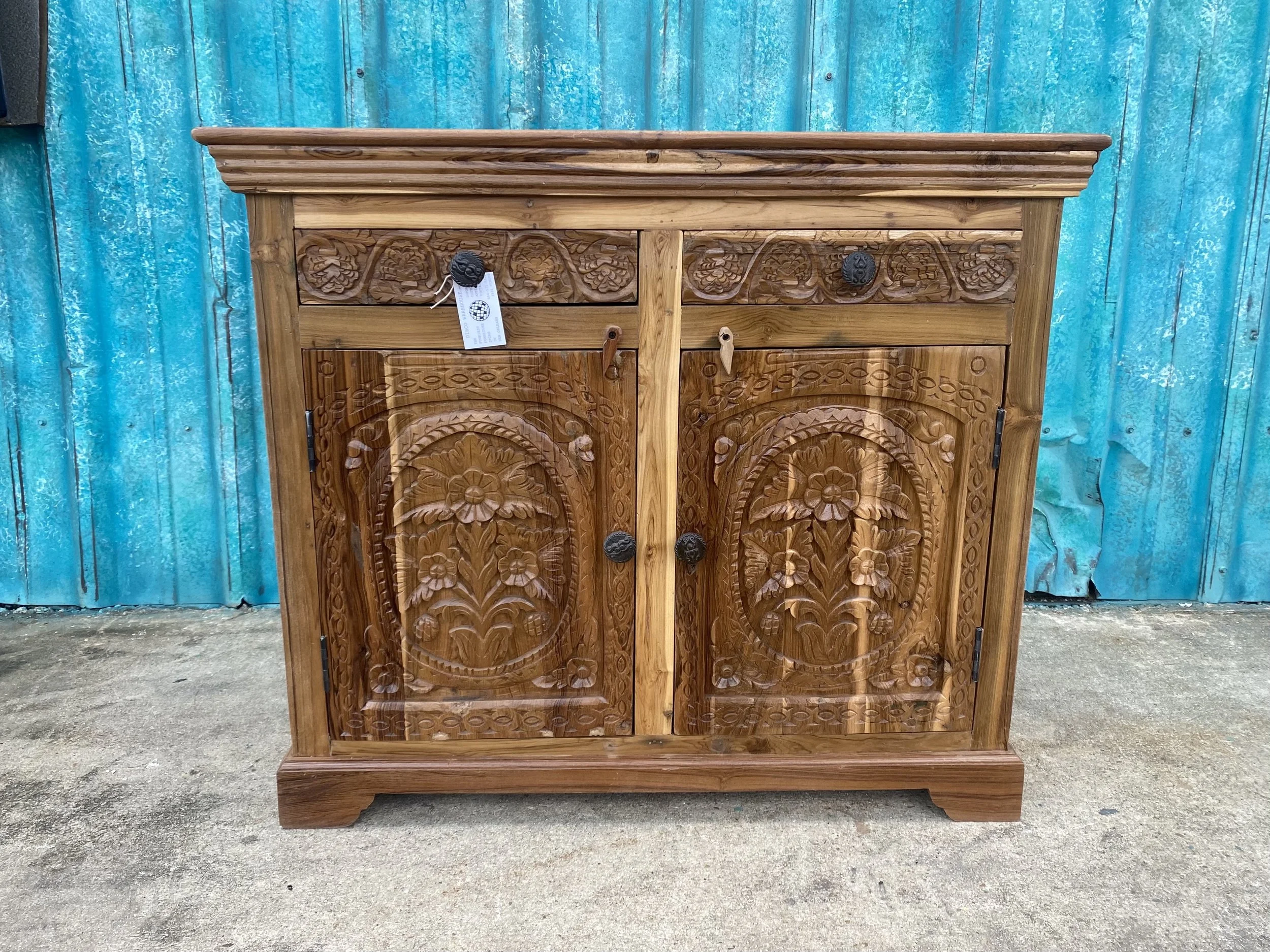 Reclaimed Wooden Cabinet w/ Carvings 43” x 18” x 38"